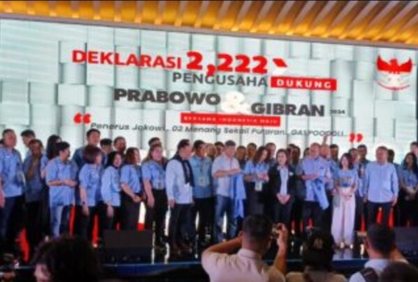 Jakarta, b-Oneindoneaia – Bertempat di Grand Sahid Hotel, sebanyak 2,222 pengusaha yang terdiri gabungan beberapa organisasi pengusaha, menyatakan deklarasi dukung Prabowo Gibran pasangan nomor 2, Minggu (14/1/2023) di Hotel Grand Sahid Jaya.