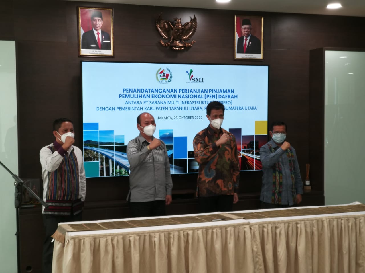 Jakarta, b-Oneindonesia – Bupati Tapanuli Utara Drs. Nikson Nababan, M.Si didampingi Sekretaris Daerah Kabupaten Tapanuli Utara Indra Simaremare, M.Si Tandatangani Perjanjian Pinjaman Pemulihan Ekonomi Nasional (PEN) Daerah dengan PT. Sarana Multi Infrastruktur (Persero) oleh Direktur Utama Edwin Syahrizal di Jakarta, Jumat (23/10).
