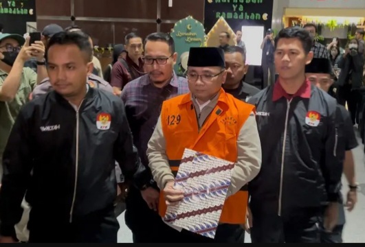 Mantan Menteri Agama sekaligus tersangka kasus kuota haji Yaqut Cholil Qoumas memakai rompi oranye dan berjalan menuju mobil tahanan di Gedung Merah Putih KPK, Jakarta, Kamis 12 Maret 2026.