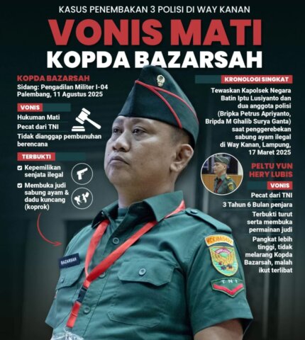 Lampung (B-Oneindonesia.com) – Kopral Dua (Kopda) Bazarsah divonis hukuman mati setelah melakukan penembakan terhadap tiga anggota Polsek Negara Batin saat penggerebekan judi sabung ayam di Kabupaten Way Kanan, Lampung, pada 17 Maret 2025 lalu.