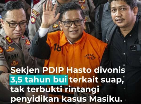 Jakarta (B-Oneindonesia.com) – Majelis hakim Pengadilan Tindak Pidana Korupsi (Tipikor) Jakarta menyatakan Sekretaris Jenderal PDIP Hasto Kristiyanto, terbukti secara sah dan meyakinkan menyediakan dana sebesar Rp400 juta yang ditujukan untuk menyuap mantan Komisioner Komisi Pemilihan Umum (KPU) Wahyu Setiawan.