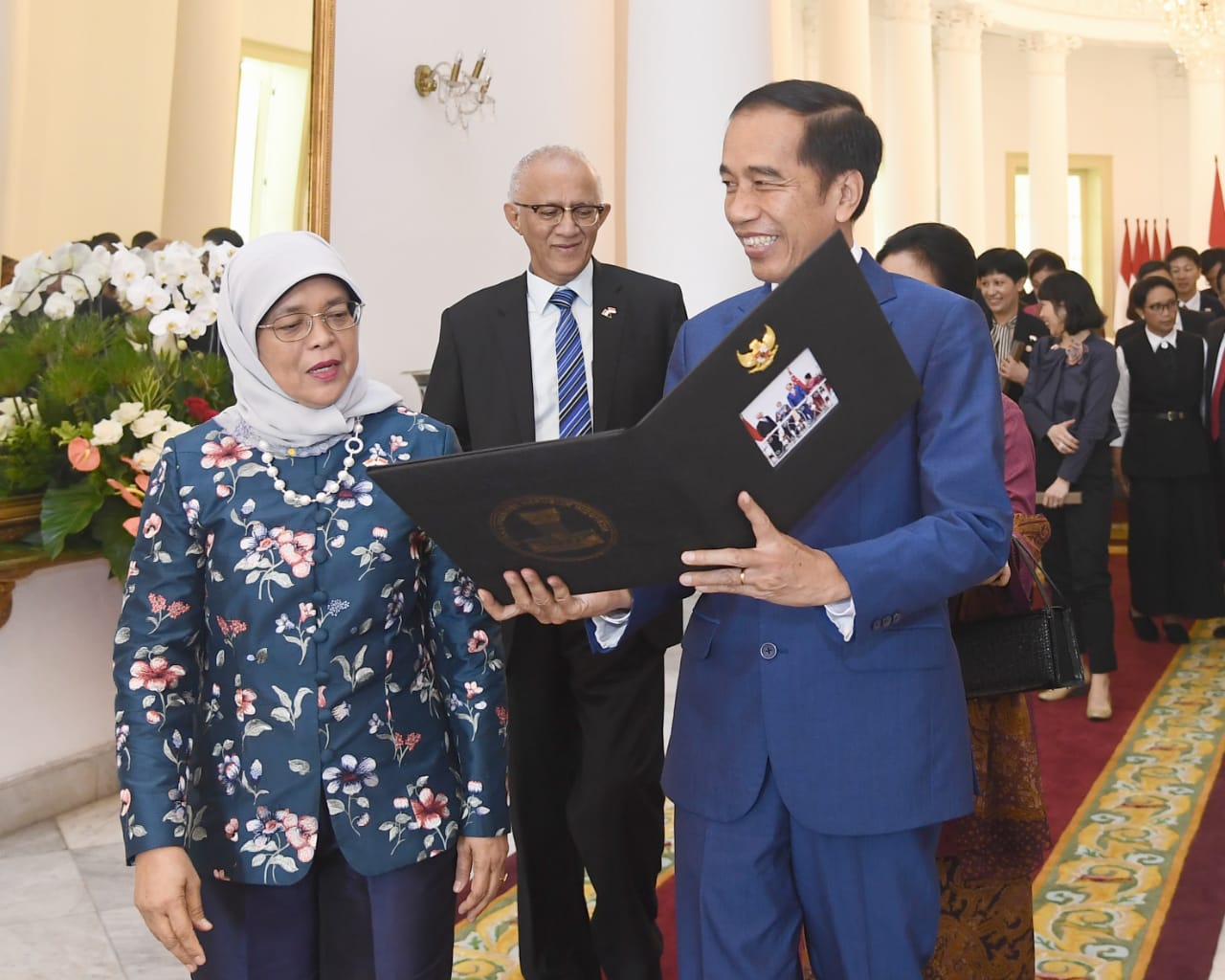 Selesai upacara kenegaraan, Presiden Jokowi mengajak Presiden Singapura masuk ke dalam Istana untuk menandatangani buku tamu kenegaraan. Di Ruang Teratai itu pula, Presiden Jokowi dan Ibu Negara Iriana Joko Widodo bersama Presiden Halimah dan Bapak Mohamed Abdullah Alhabshee melakukan sesi foto bersama.
