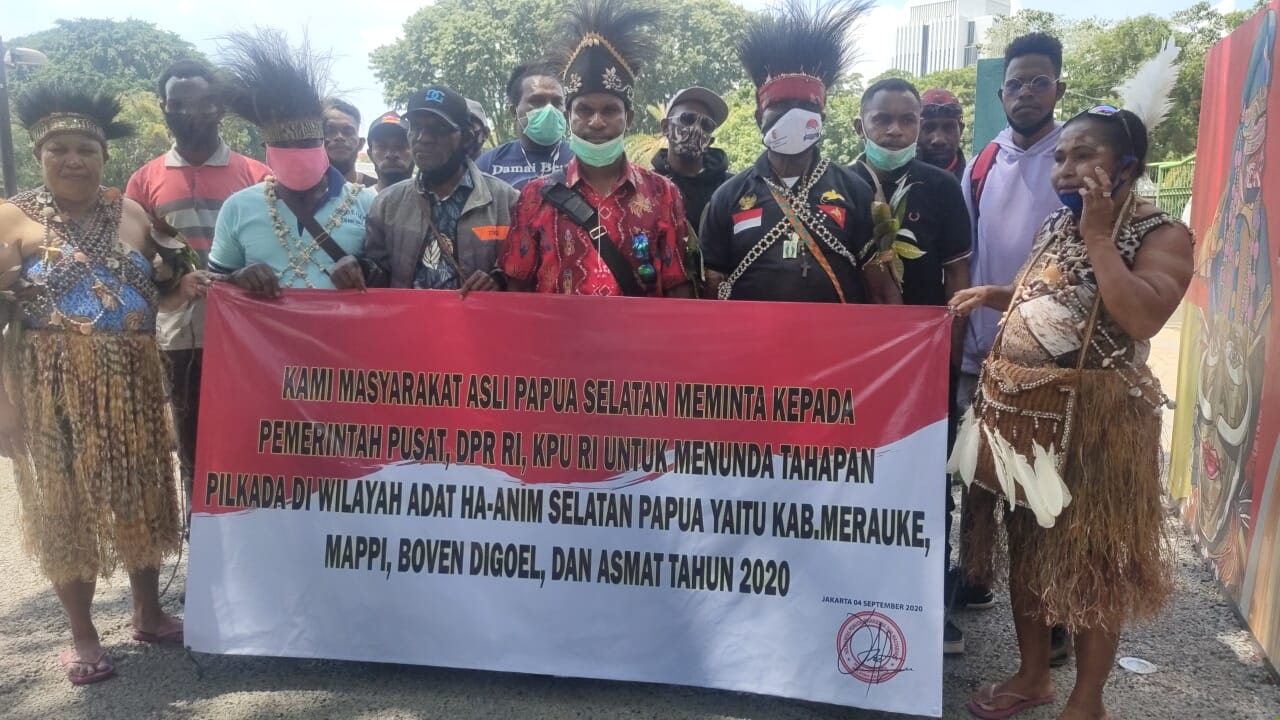 Bersama dengan Warga Asli Papua Selatan, juga meminta kepada pemerintah pusat, DPR RI dan KPU RI untuk menunda tahapan pilkada 2020 di wilayah adat Ha-Anim Selatan Papua yaitu, Kabupaten Merauke, Mappi, Boven Digoel, dan Asmat,” dikatakan Martinus Mahuze, Ketua Solidaritas Pemuda Mahasiswa dan Masyarakat Peduli Demokrasi Wilayah Ha-Anim, saat melakukan aksi di depan Istana Negara, Jakarta, Jumat (4/9).
