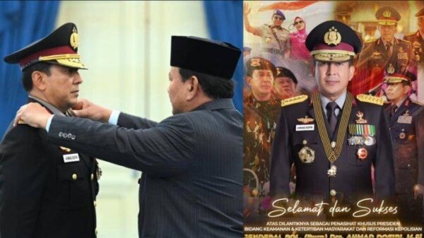 Jakarta(B-Oneindonesia.com)-Presiden Prabowo Subianto memberikan pangkat Jenderal Polisi Kehormatan bintang 4, kepada Ahmad Dofiri, sebelum melantiknya sebagai Penasihat Presiden Bidang Keamanan dan Ketertiban Masyarakat (Kamtibmas) dan Reformasi Polri.
