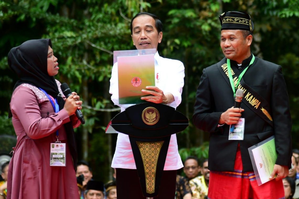 Pekanbaru-b-oneindonesia–Presiden Joko Widodo menyerahkan 41 Surat Keputusan (SK) Perhutanan Sosial untuk 20.890 kepala keluarga di Provinsi Riau. SK tersebut mencakup pengelolaan lahan seluas 73.670 hektare lahan yang berupa 39 SK hutan desa dan hutan kemasyarakatan serta 2 hutan adat.