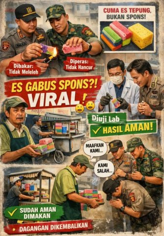 “Aparat TNI dan Polri yang sempat mengamankan penjual es kue jadul di Utan Panjang, Kemayoran, mengakui kesalahannya dan meminta maaf. Video yang sempat viral terkait tudingan es kue jadul berbahan spons itu pun dipastikan keliru”.