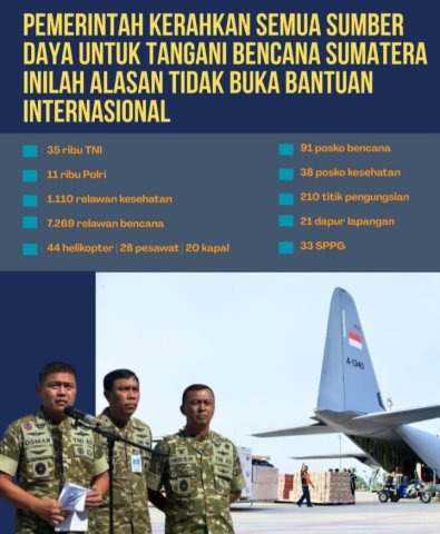 Pemerintah pusat bergerak melalui pola kerja yang tidak bergantung pada keributan di media sosial. Bantuan logistik dikirim lewat jalur darat dan udara, armada pesawat serta helikopter menjangkau wilayah yang tidak lagi dapat ditembus kendaraan darat, sementara instansi teknis memulihkan jaringan listrik, komunikasi, dan akses jalan agar pergerakan barang dan tenaga lapangan tetap bertumpu pada sistem. BMKG memperbarui peringatan cuaca, lembaga penyelamatan nasional menyesuaikan operasi berdasarkan peta risiko, dan koordinasi lintas provinsi dijalankan agar penanganan di Aceh, Sumatera Utara, dan Sumatera Barat saling memperkuat sehingga instruksi dan koordinasi tidak tumpang tindih.