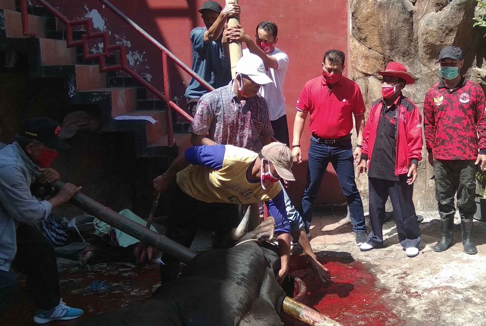 Batu, b-Oneindonesia – Guna rasa syukur dan berbagi di Hari Raya Idul Adha 1441 Hijriah, DPC PDI Perjuangan Kota Batu salurkan daging kurban dan 250 paket sembako kepada warga sekitar di tengah pandemi. Total ada dua ekor sapi bantuan dari DPR RI Ahmad Basarah Dapil Malang Raya. Selain itu juga disembelih tiga ekor kambing hasil dari patungan para kader.