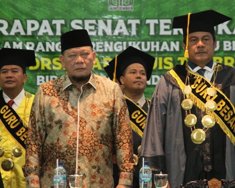 Demikian disampaikan LaNyalla saat mengisi Orasi Ilmiah dalam acara pengukuhan Prof. Dr. Drs. H. Abdul Muis Tabrani, MM sebagai Guru Besar bidang Ilmu Pendidikan, di Aula IAIN Jember, Senin (10/2/2020), pagi. “Saya ucapkan selamat kepada Prof. Abdul Muis Tabrani, semoga pengukuhan ini memberi manfaat bagi bangsa dan negara,” sapa LaNyalla.
