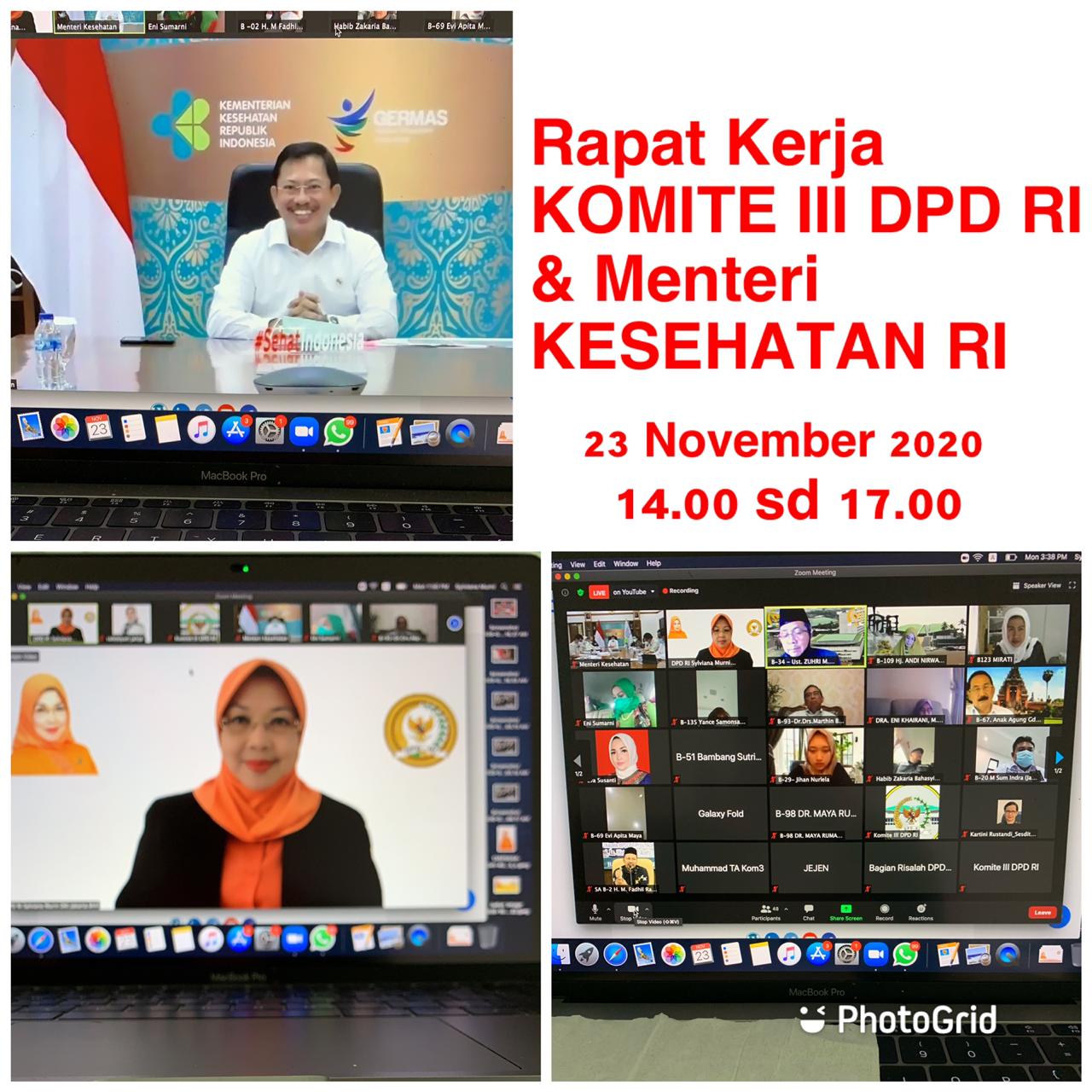 Salah satu benang merah dari Rapat Kerja yang dilaksanakan secara virtual antara Komite III DPD RI dengan Kementerian Kesehatan RI, Senin 23 November 2020. Rapat dipimpin langsung oleh Ketua Komite III, Prof.Dr. Hj. Sylviana Murni dan dihadiri Menteri Kesehatan RI, Terawan Agus Putranto beserta jajaran Kemenkes dan para anggota (senator) Komite III DPD RI dari 34 provinsi.